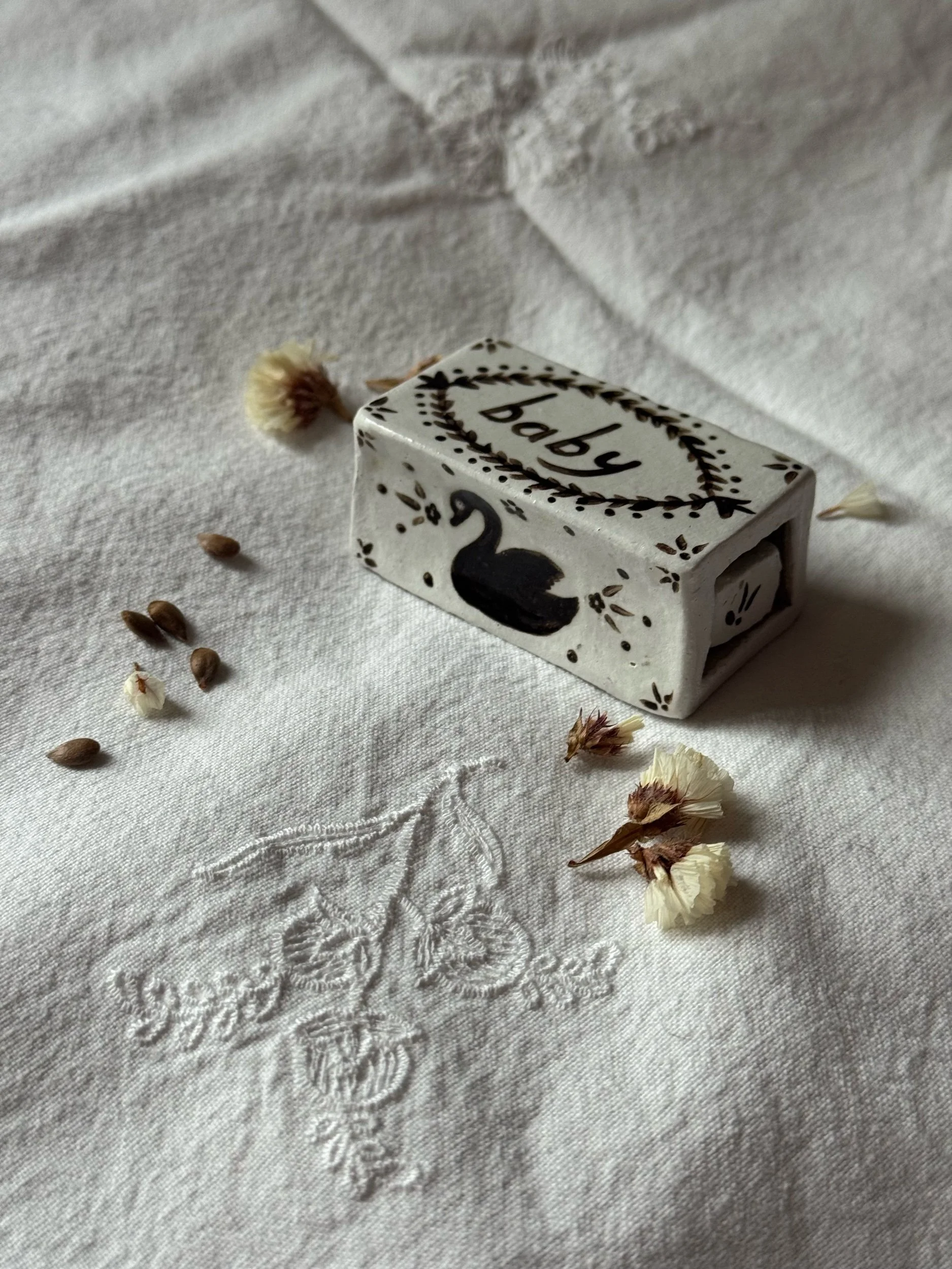 this one of a kind piece is painted with “baby” in a leafy frame on the top, a swan on one side and a butterfly on the other side, and little ornaments on the inner drawer.