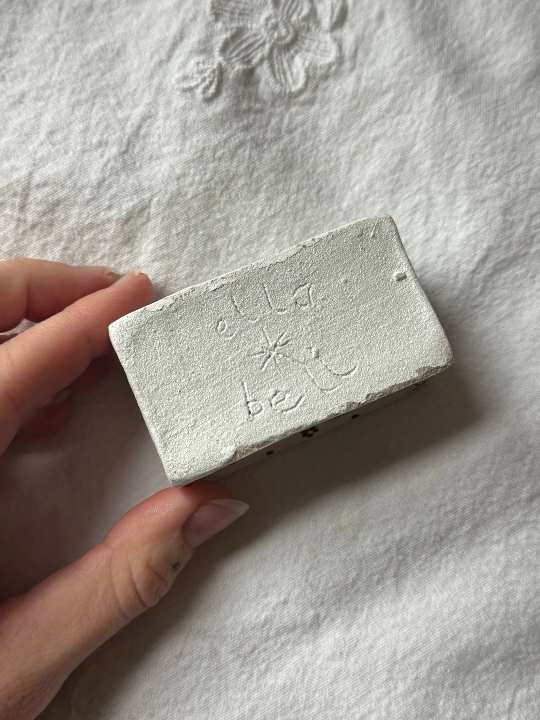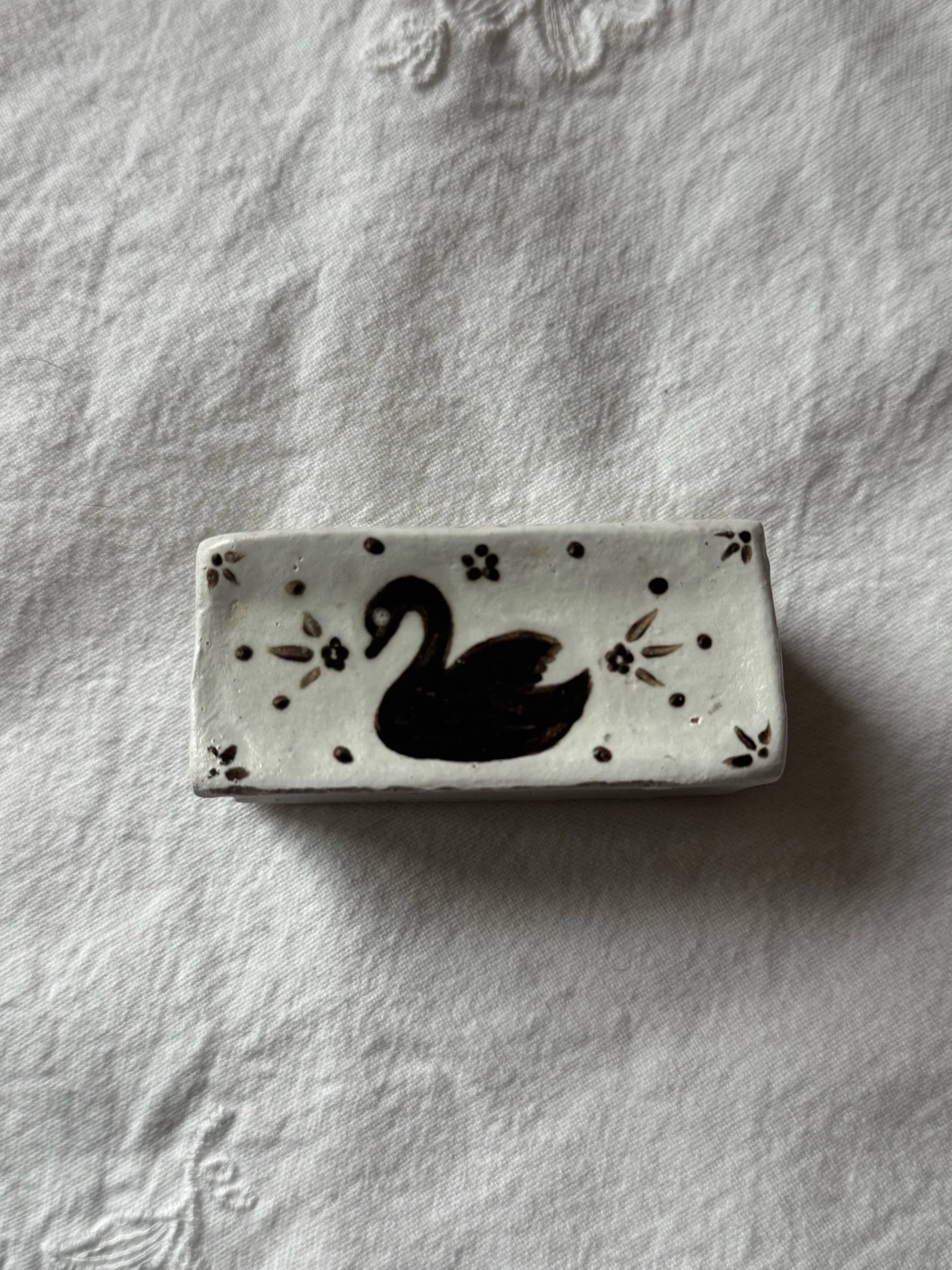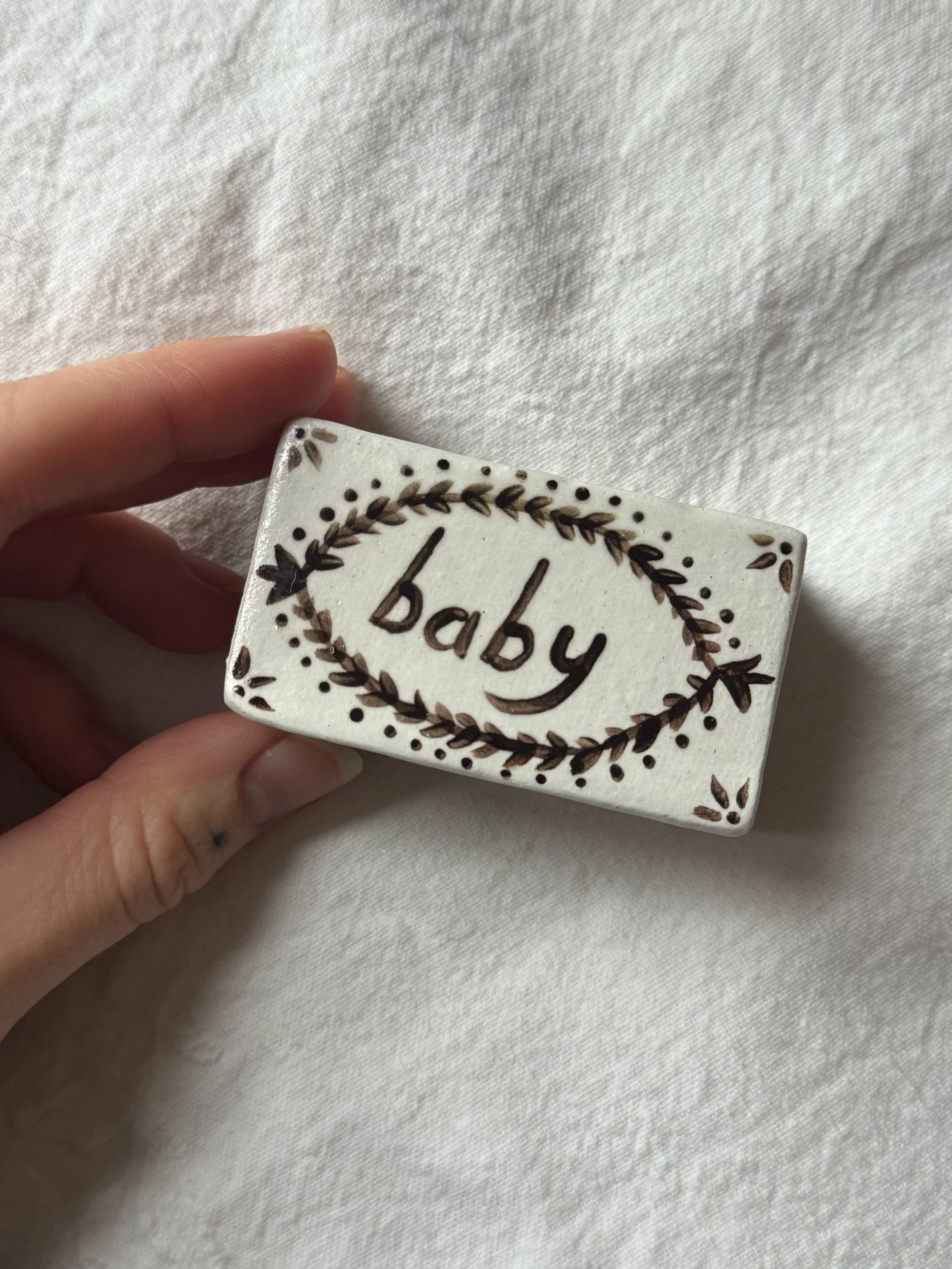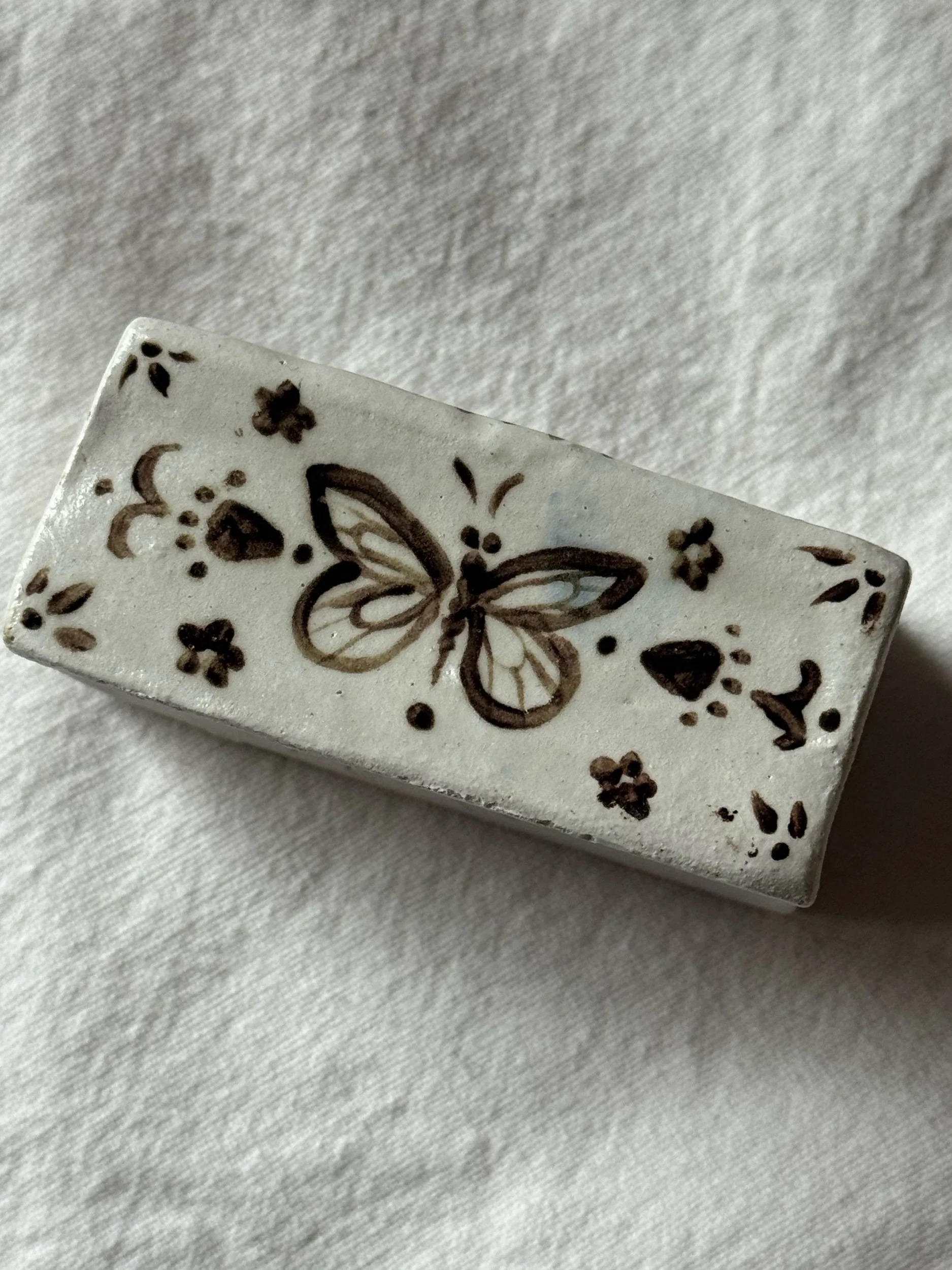 made with stoneware clay, i build these little boxes by hand with mini slabs of clay. they are then bisque fired, and then i paint them with underglazes, before they are dipped in a transparent glaze and then fired again. it’s a slow process, and you never quite know what’s going to come out of the kiln!